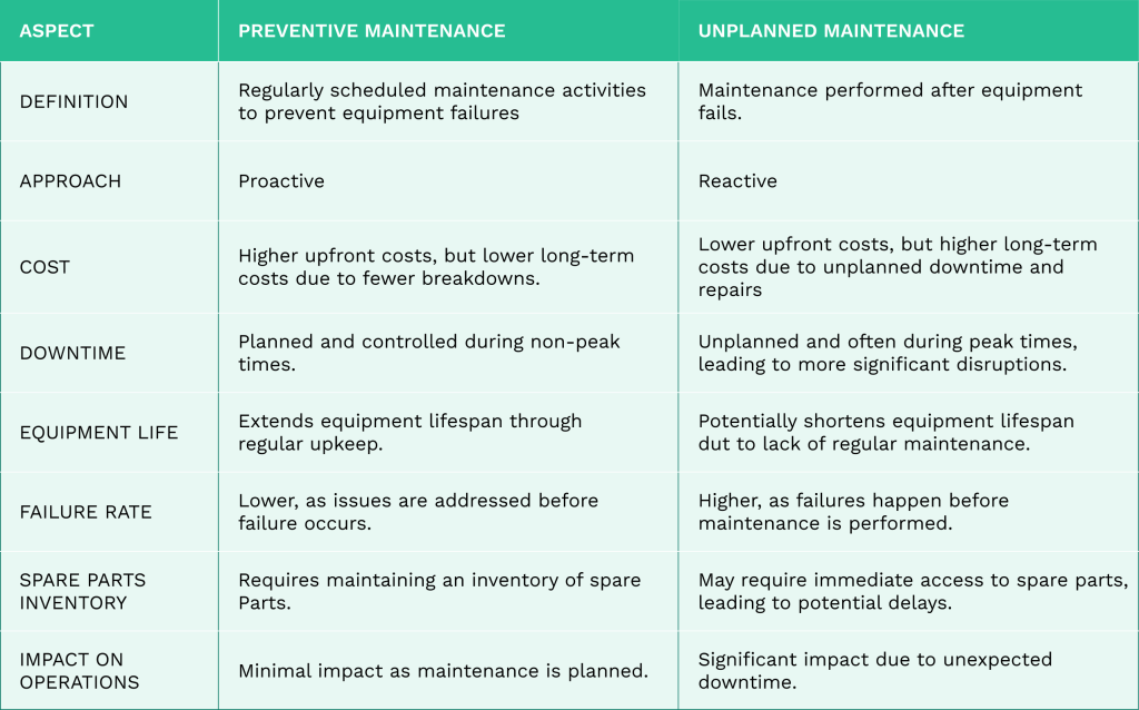 Unplanned maintenance can lead to more extended downtimes and higher repair costs than planned maintenance activities.