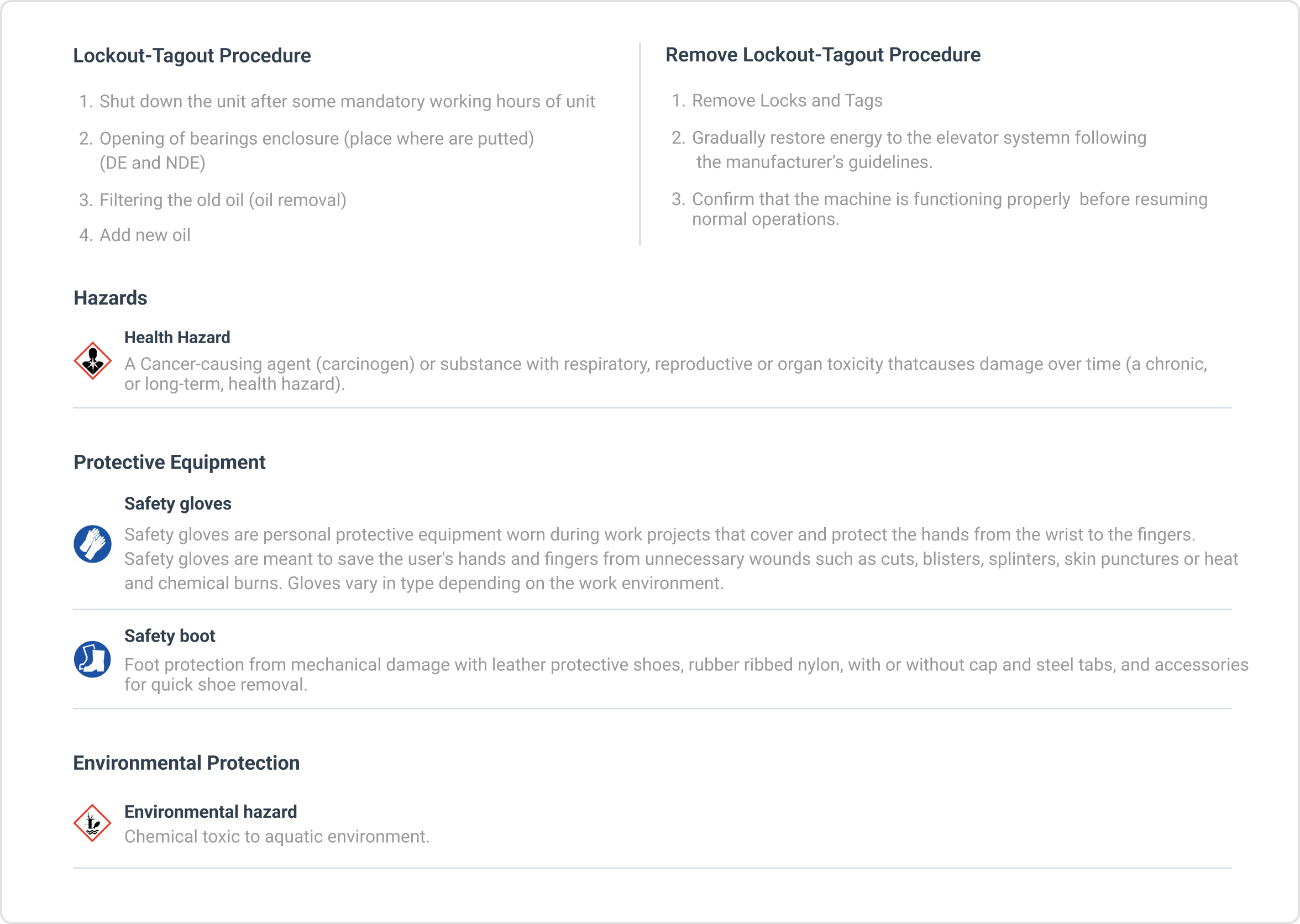 Predefine hazards and risks, necessary personal protective equipment, and lockout tagout procedures for each piece of equipment to document processes and prevent potential accidents.