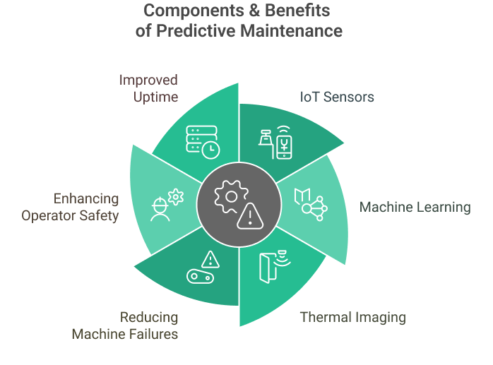 A predictive maintenance program includes key components and advantages such as reducing machine failures, enhancing operator safety, and improving asset uptime and equipment lifespan.
